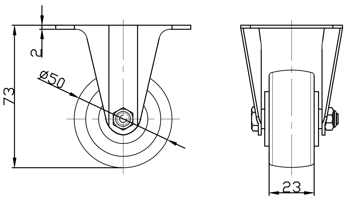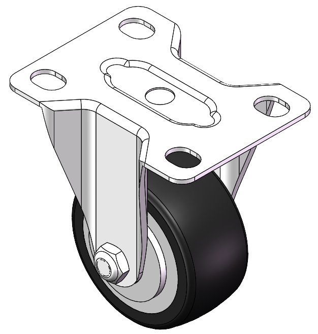 | Rigid Caster with Stamping Fabricated Caster Fork 44.5 x 30mm (1-3/4" x 1-1/8") Bolt Hole Spacing. Zine-Plated, Mounting Type - Top Plate. Polypropylene Wheel Center and tread. White and black finish. Bearing: Ball Bearing. |