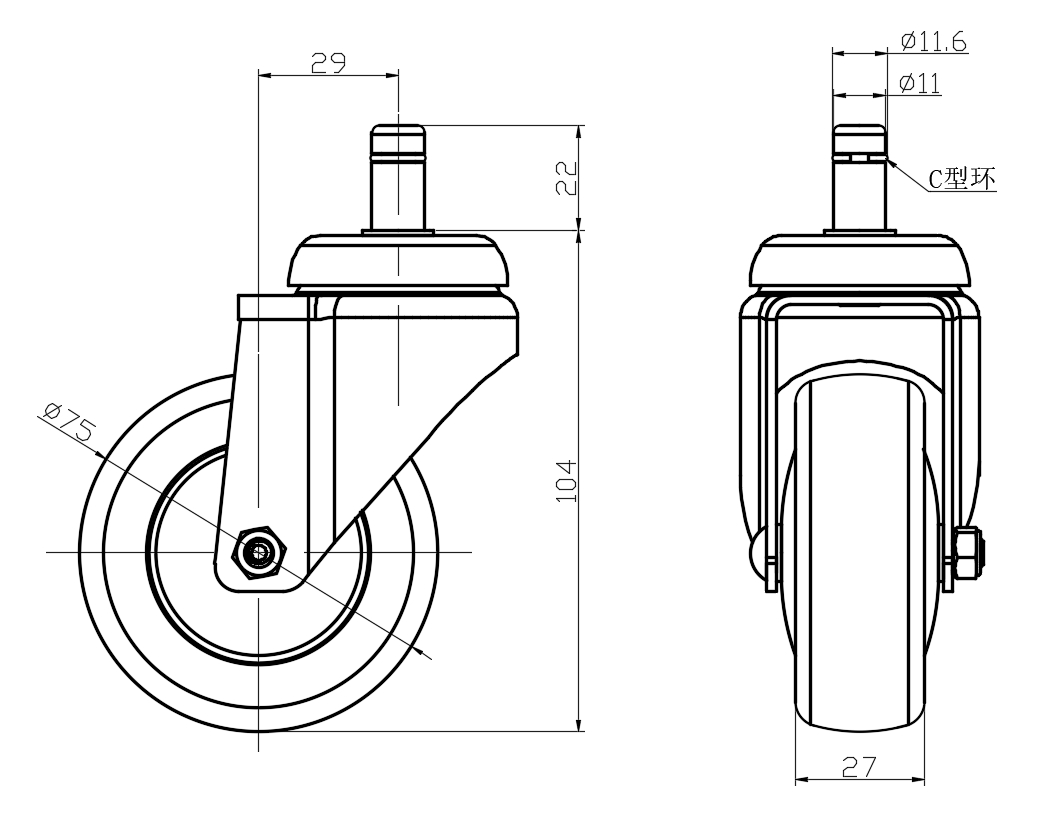 | 活动式脚轮,插心铆合冲压脚架—Ø11x22L