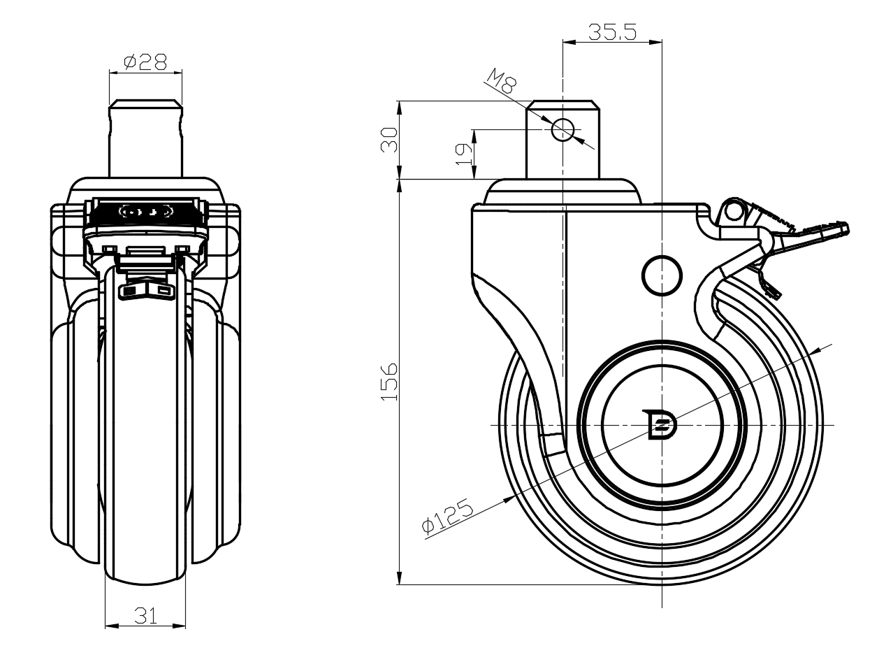 | 配有双煞式,锁定系统的脚轮。插心铆合冲压脚架—Ø28x30L
