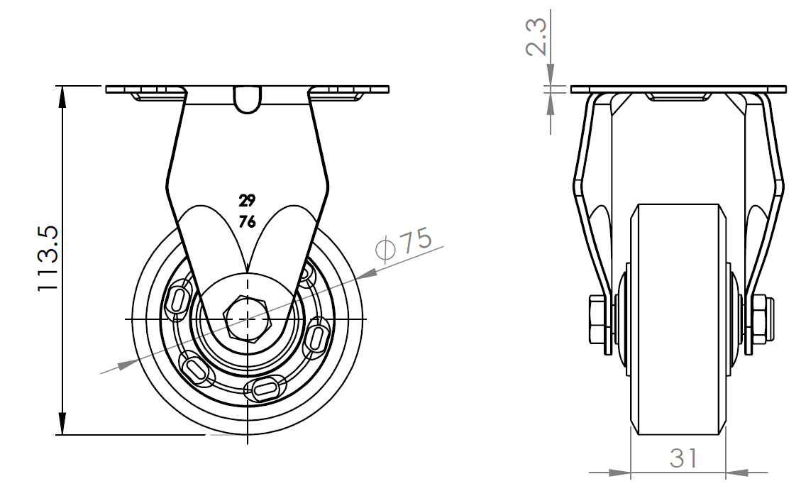 Rigid Caster with Stamping Fabricated Caster Fork 72 x 53.5 mm (2-7/8" x 2-1/8") Bolt Hole Spacing.
