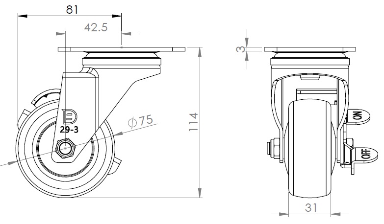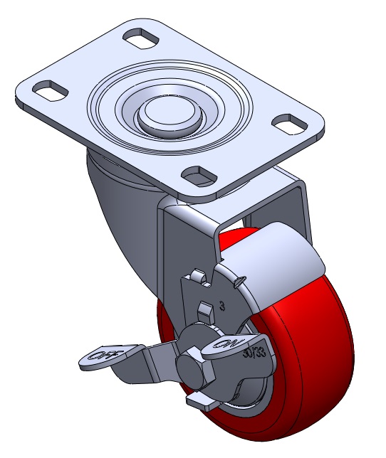 | Casters with Side Brakes and With locking system. Top Plate Riveted and Fork – 75 x 45 mm (3" x 1-3/4") Bolt Hole Spacing. Zine-Plated, Top Plate (3T) Mounting Type system. High-Quality Impact-Resistant Polypropylene Wheel Center, High-Quality Reinforced Polypropylene Rubber (TPR) Wheel Tread. Red color, Bearing – Ball Bearings. |
