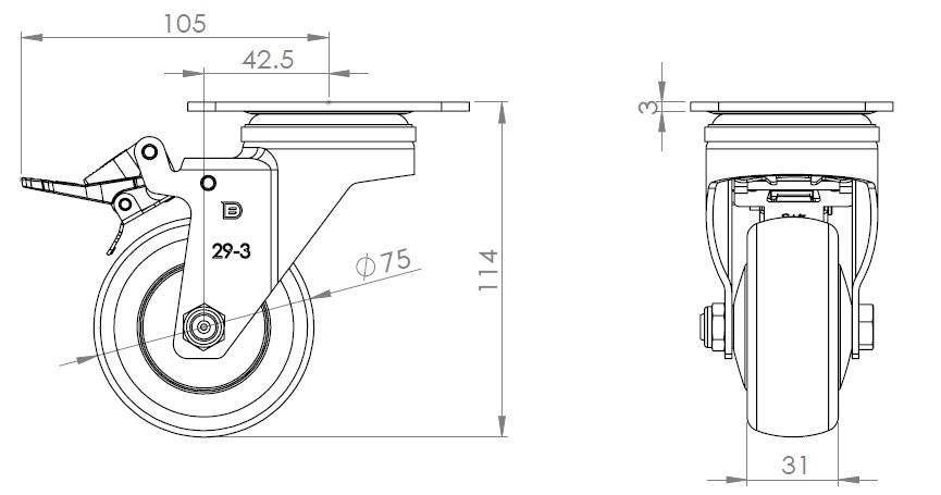 | Casters with a Total Brake and With locking system. Premium Fork with Riveted Fork. Zine-Plated, Top Plate (3T) Mounting Type system. High-Quality Impact-Resistant Polypropylene Wheel Center with High-Quality Reinforced Polypropylene Rubber (TPR) Wheel Tread. Dark gray, Bearing with Ball Bearings. |