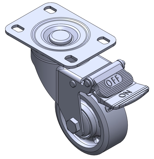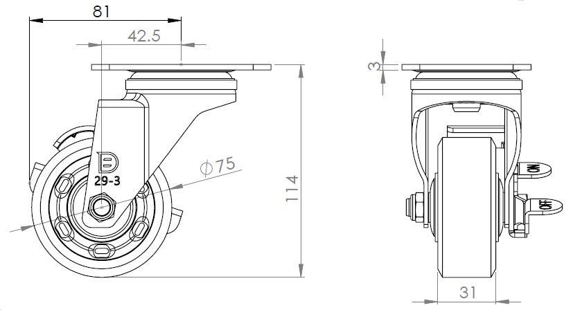 | Casters with Side Brakes and With locking system. Top Plate Riveted and Stamping - 75 x 45 mm (3" x 1-3/4") Bolt Hole Spacing. Zine-Plated, Top Plate (3T) Mounting Type system. Reinforced, impact-resistant polypropylene Wheel Center with High-Quality Reinforced Polypropylene Rubber (TPR) Wheel Tread. Dark gray, Bearing - Ball Bearings. |