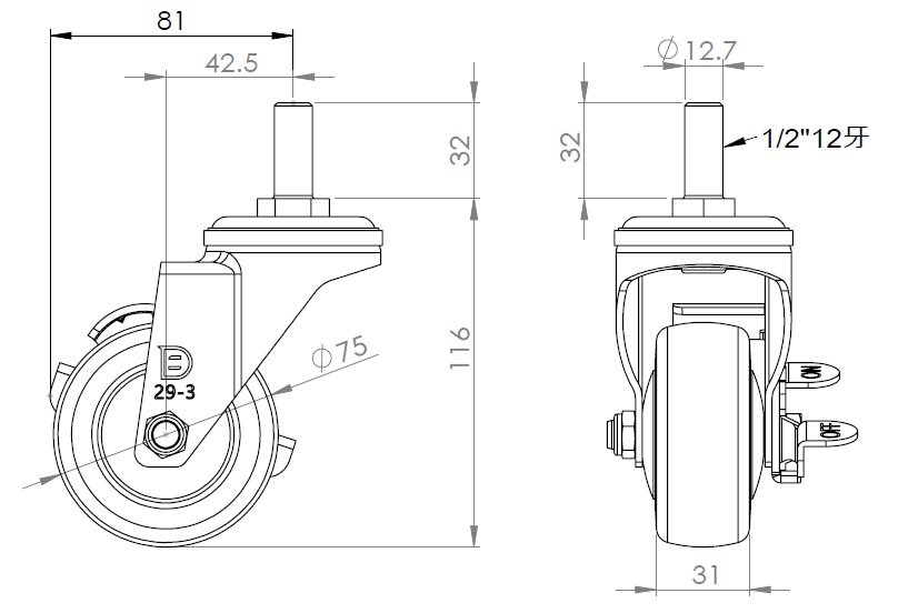 Casters with Side Brakes and With locking system. Threaded Stem Riveted Pressed Fork – 1/2-12 threads.