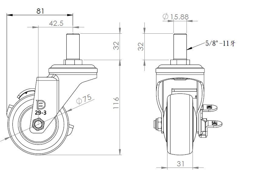 Casters with Side Brakes and With locking system. Stamping, Riveted Fork with 5/8-11 thread.