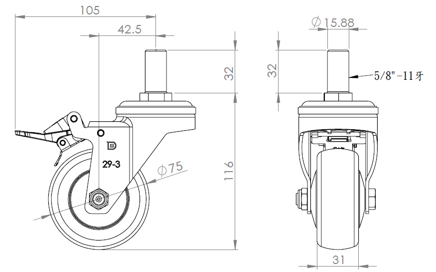Casters with Total Brakes and With locking system. Threaded Stem Riveted Pressed Fork—5/8-11.