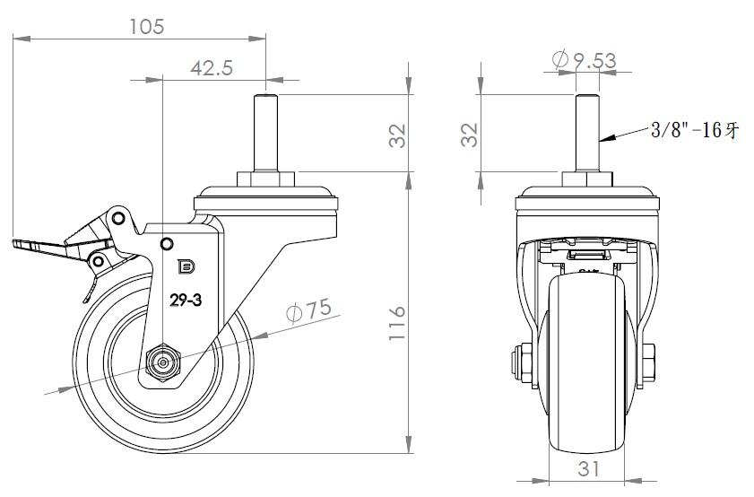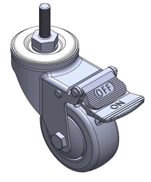 Casters with Total Brakes and With locking system. Threaded Stem Riveted Pressed Fork—3/8-16.