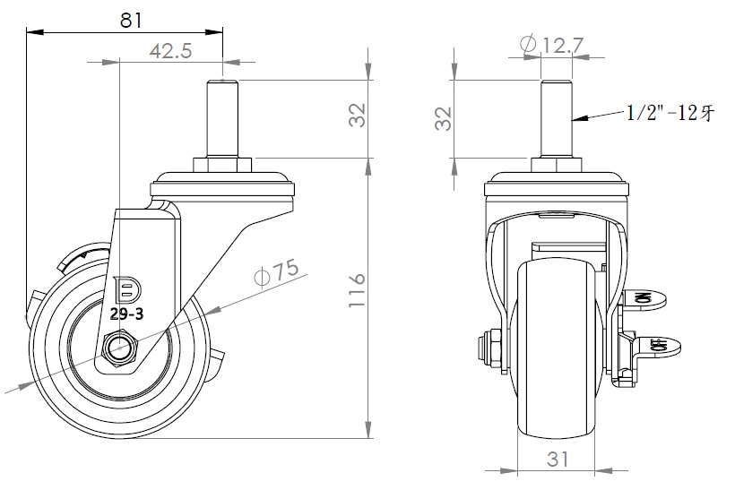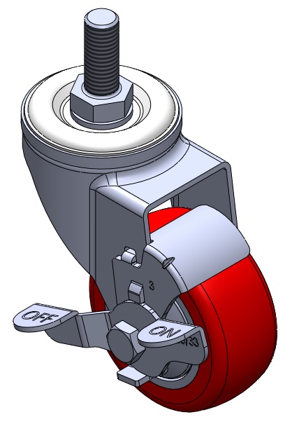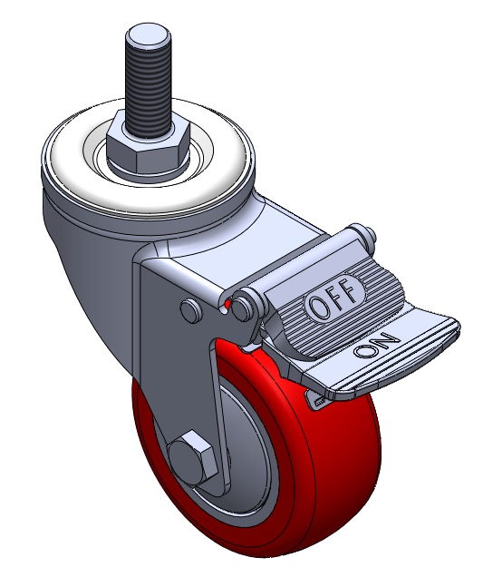 Casters with Side Brakes and With locking system. Threaded Stem Riveted Pressed Fork – 1/2-12 threads.