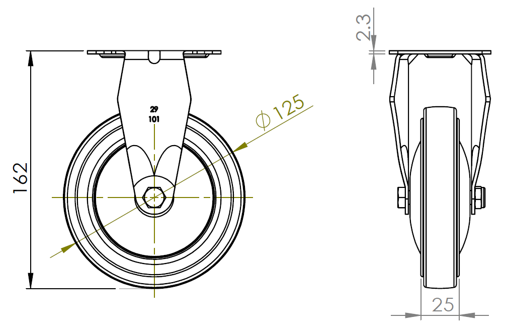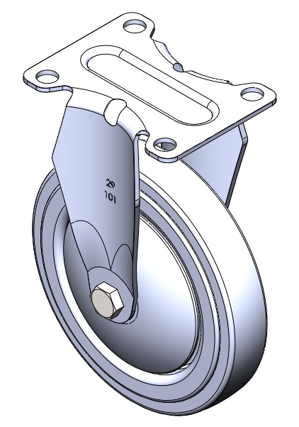 | Rigid Caster with integrally molded Stamping footrest and 72 x 53.5 mm (2-7/8" x 2-1/8") Bolt Hole Spacing. Zine-Plated, Mounting Type - Top Plate, and attached metal cover. High-Quality Impact-Resistant Polypropylene Wheel Center with High-Quality Reinforced Polypropylene Rubber (TPR) Wheel Tread. Dark gray, Plain Bearing. |
