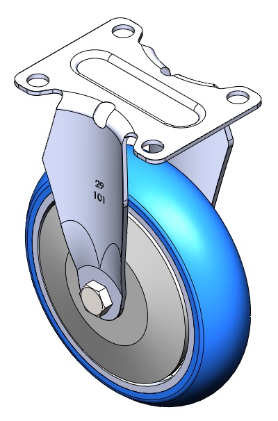 | Rigid Caster with integrally molded Stamping footrest and 72 x 53.5 mm (2-7/8" x 2-1/8") Bolt Hole Spacing. Zine-Plated, Mounting Type - Top Plate, and plastic cover. Aluminum core with High Quality Polyurethane Wheel Tread. Blue color. Bearings: Ball Bearings. |