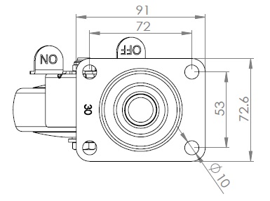 Plate Size 91 x 72.6mm Bolt Hole Spacing 72 x 53mm Plate Hole 10mm Offset 40mm Swivel Interference 180mm Overall Height 139mm Swivel Radius 90mm Hardness Of Tread 82±5° Shore A Load Capacity (Dynamic) 80kgs |