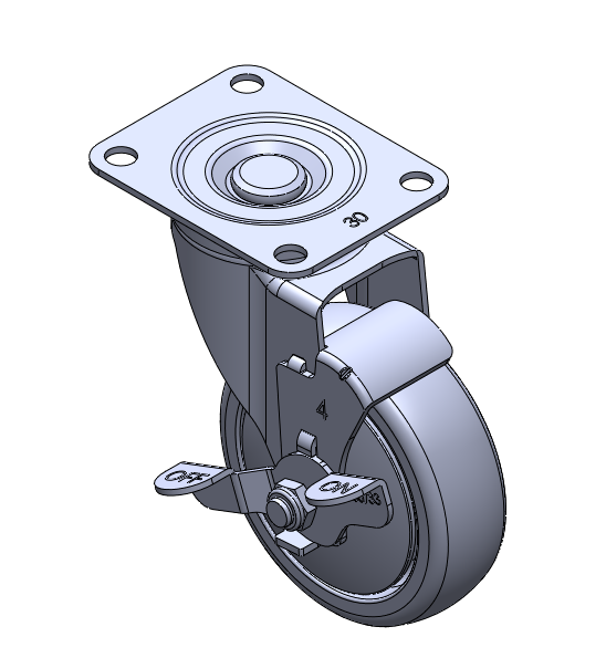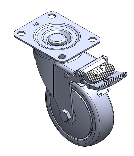 Casters with Total Brakes and a With locking system. Top Plate with Riveted, Stamping Fork and 72 x 53.5 mm (2-7/8" x 2-1/8") Bolt Hole Spacing.
