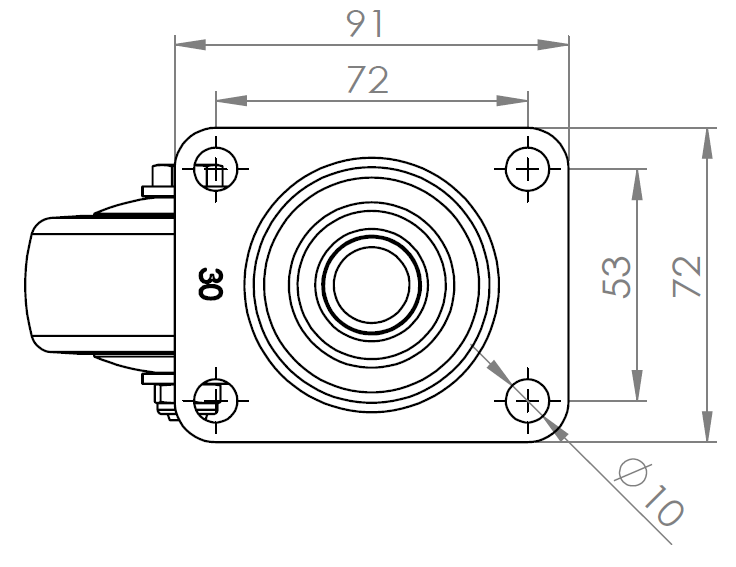 Sliding Caster, Top Plate with Riveted Stamping Fork and 72 x 53.5 mm (2-7/8" x 2-1/8") Bolt Hole Spacing