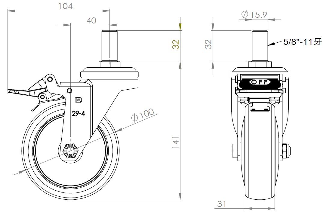 Casters with Total Brakes and a With locking system. Threaded Stem Riveted Pressed Fork - 5/8-11.