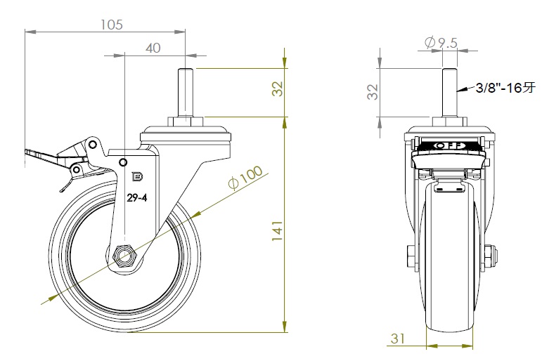 | Casters with Total Brakes and With locking system. Riveted Stamping Fork with 3/8-16 threads Zine-Plated, Mounting Type - Threaded Stem High-Quality Impact-Resistant Polypropylene Wheel Center, High-Quality Reinforced Polypropylene Rubber (TPR) Wheel Tread Dark gray, Bearing—Ball Bearings |