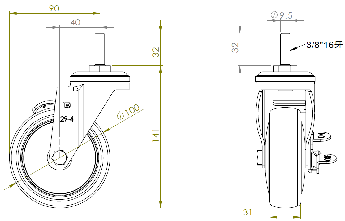 | Casters with Side Brakes and With locking system. Threaded Stem Riveted Pressed Fork - 3/8" - 16 UNC Anodized finish, Mounting Type - Threaded Stem High-Quality Impact-Resistant Polypropylene Wheel Center, High-Quality Reinforced Polypropylene Rubber (TPR) Wheel Tread Dark gray, Bearing - Ball Bearings. |