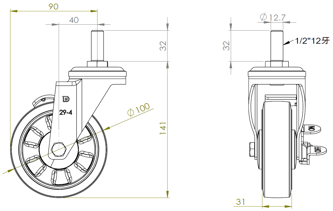 | Casters with Side Brakes and With locking system. Threaded Stem, Riveted Stamping Fork - 1/2-12 threads Zine-Plated, Mounting Type - Threaded Stem Reinforced, impact-resistant polypropylene Wheel Center, High-Quality Reinforced Polypropylene Rubber (TPR) Wheel Tread Dark gray, Bearing - Ball Bearings |
