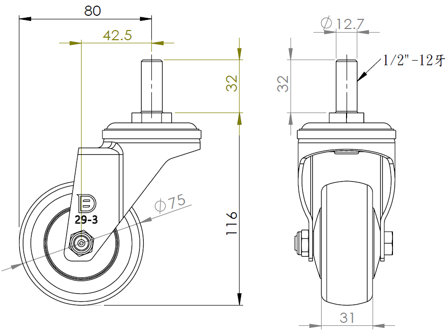 Swivel Caster, Riveted Stamping Fork - 1/2-12 threads