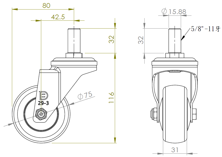 Swivel Caster, Riveted Stamping Fork - 5/8-11 threads