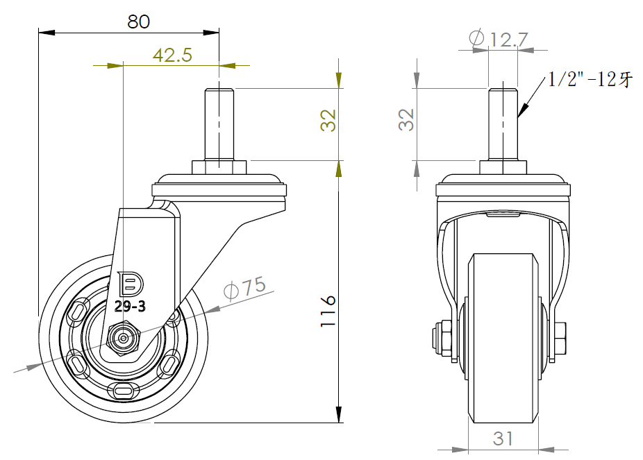 Swivel Caster with Riveted Stamping Fork - 1/2" - 12 UNC