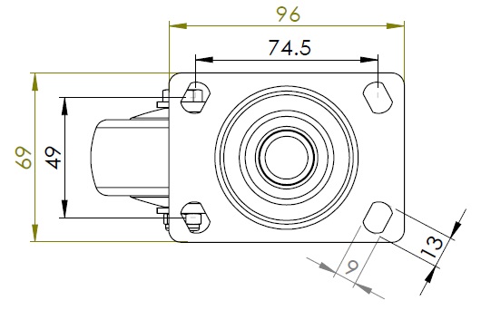 Plate Size 96 x 69mm Bolt Hole Spacing 74.5 x 49mm Plate Hole 13 x 9mm Offset 42.5mm Swivel Interference 160mm Overall Height 114mm Swivel Radius 80mm Hardness Of Tread 72±5° Shore A Load Capacity (Dynamic) 90kgs |