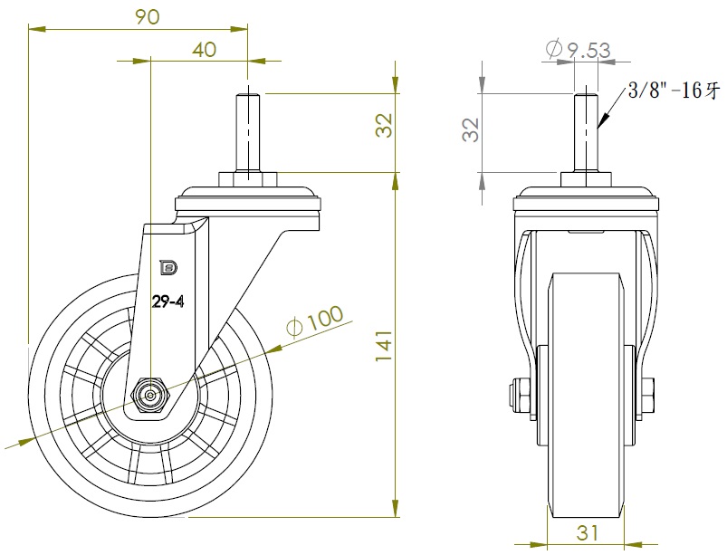 Swivel Caster, Riveted Stamping Fork - 3/8-16 threads