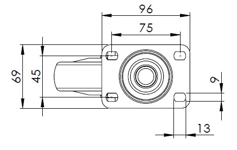 Plate Size 96 x 96mm Bolt Hole Spacing 75 x 45mm Plate Hole 13 x 9mm Offset 37.5mm Swivel Interference 260mm Overall Height 164mm Swivel Radius 100mm Hardness Of Tread 82±5° Shore A Load Capacity (Dynamic) 100kgs |