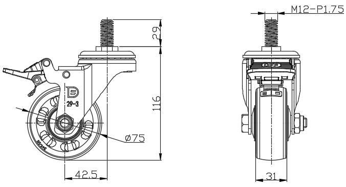 Casters with a Total Brake and With locking system. Threaded Stem Riveted Pressed Fork—M12-P1.75.