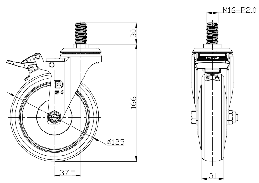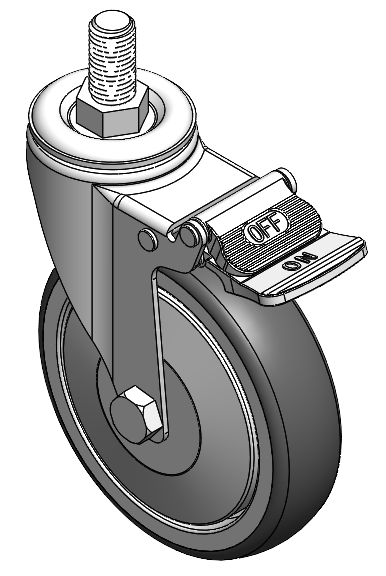| Castors with Total Brake Locking system. Thread Riveting Stamping Tripod—M16- P2 Extended control lever surface, Threaded Stem installation device Reinforced impact-resistant High-quality Impact Resistance Polypropylene Wheel Center,High-Quality Thermoplastic Rubber (TPR) wheel tread Pearlite dark grey, Bearing – Ball Bearing. |