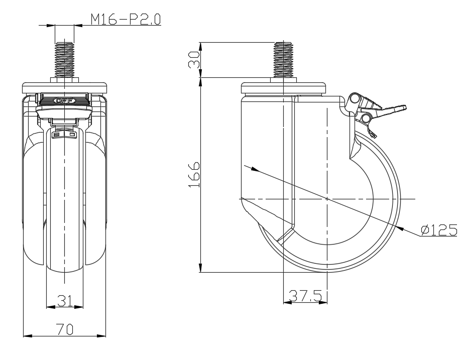 | Castors with Total Brake Locking system. Thread Riveting Stamping Tripod—M16-P2.0 Extended control lever surface, Threaded Stem installation device High-quality Impact Resistance Polypropylene Wheel Center,High-Quality Thermoplastic Rubber (TPR) Wheel Tread, exquisite appearance plastic cover decoration Pearlite dark grey, Bearing – Ball Bearing. |