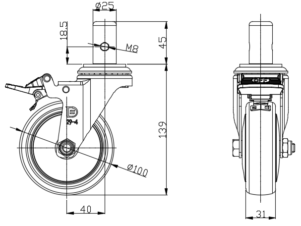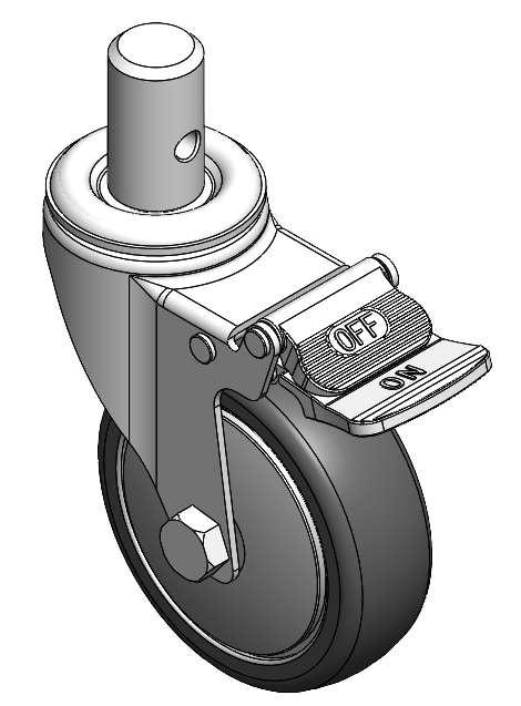| Castors with Total Brake Locking system. Insert riveting stamping Fork-Ø25x45L Extended control lever surface, plug-in installation, M8 thread High-quality Impact Resistance Polypropylene Wheel Center,High-Quality Thermoplastic Rubber (TPR) Wheel Tread, Wheel Tread with added thermoplastic shrink film protection Pearlite dark grey, Bearing – Ball Bearing. |