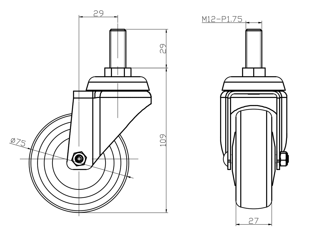 | Swivel Caster, thread-Riveted Stamping Fork—M12-P1.75 Extended control lever surface, Mounting Type - Threaded Stem High-quality Impact Resistance Polypropylene Wheel Center,High-Quality Thermoplastic Rubber (TPR) Wheel Tread Pearl-colored dark gray, Bearing—Ball Bearing. |