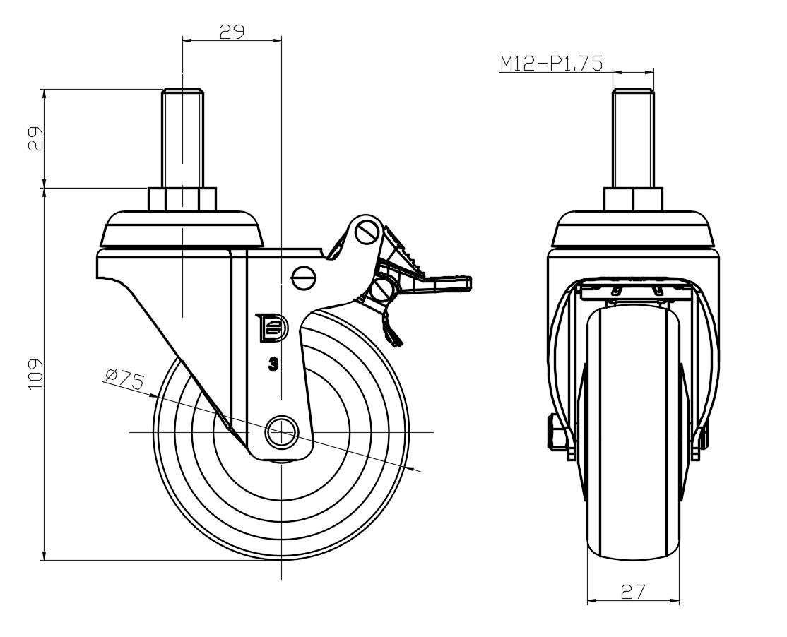 | Castors with Total Brake Locking system. Threaded Fork - M12-P1.75 Extended control lever surface, Mounting Type - Threaded Stem High-quality Impact Resistance Polypropylene Wheel Center,High-Quality Thermoplastic Rubber (TPR) Wheel Tread Pearl grey, Bearing - Ball Bearing. |