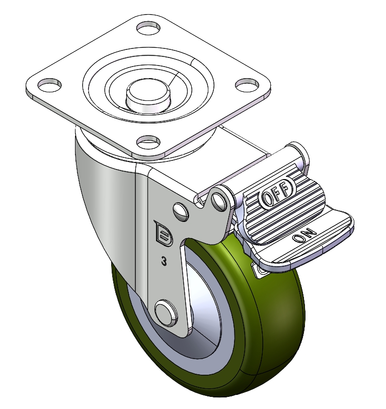| Castors with Total Brake Locking system. Riveted Stamping Fork - medical holes Surface Zine-Plated, Fork Mounting Type High-quality Impact Resistance Polypropylene Wheel Center, High Quality Polyurethane Wheel Tread Grey, Bearing - Ball Bearings. |
