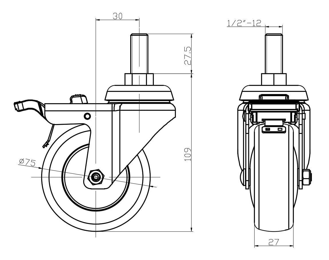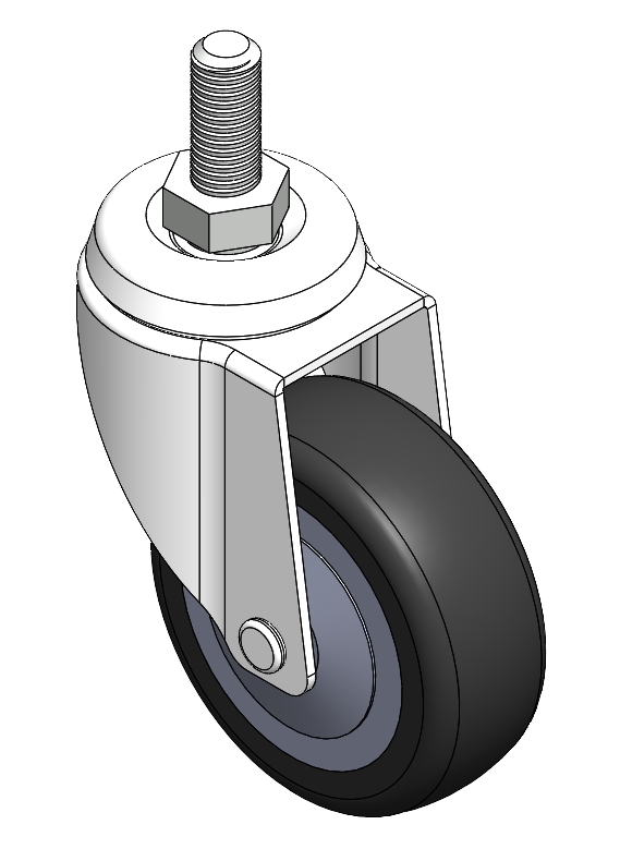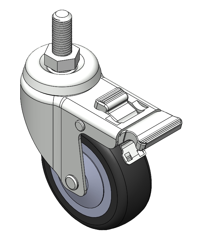 | Casters with Total Brake locking system. Thread-Riveted Fork—1/2"-12 Zine-Plated, Mounting Type - Threaded Stem High-quality Impact Resistance Polypropylene Wheel Center, Thermoplastic Elastomer (TPR) Wheel Tread Pearl grey, Bearing—Ball Bearing. |