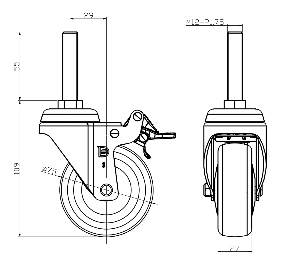 | Castors with Total Brake Locking system. Threaded Fork - M12-P1.75 Extended control lever surface, Mounting Type - Threaded Stem High-quality Impact Resistance Polypropylene Wheel Center,High-Quality Thermoplastic Rubber (TPR) Wheel Tread Pearl-finish dark grey, Bearing - Ball Bearing. |