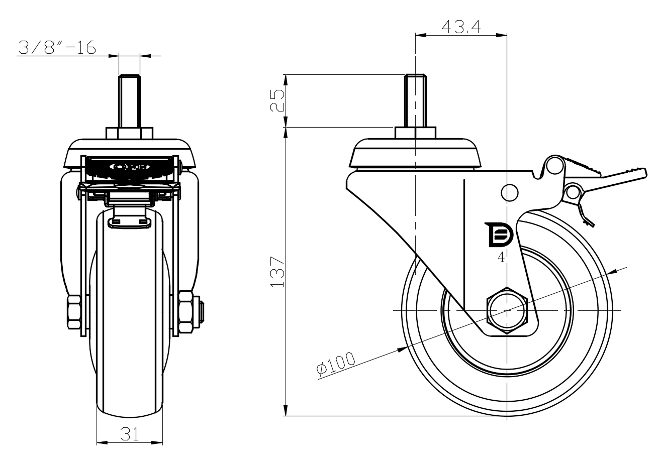 Casters with a Total Brake and With locking system. Threaded Stem Riveted Pressed Fork—3/8"-16"