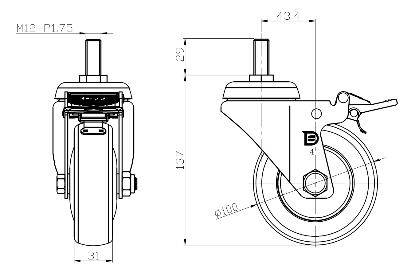 | Castors with Total Brake Locking system. Threaded Fork - M12-P1.75 Extended control lever surface, Mounting Type - Threaded Stem High-quality Impact Resistance Polypropylene Wheel Center,High-Quality Thermoplastic Rubber (TPR) Wheel Tread Pearl grey, Bearing - Ball Bearing. |
