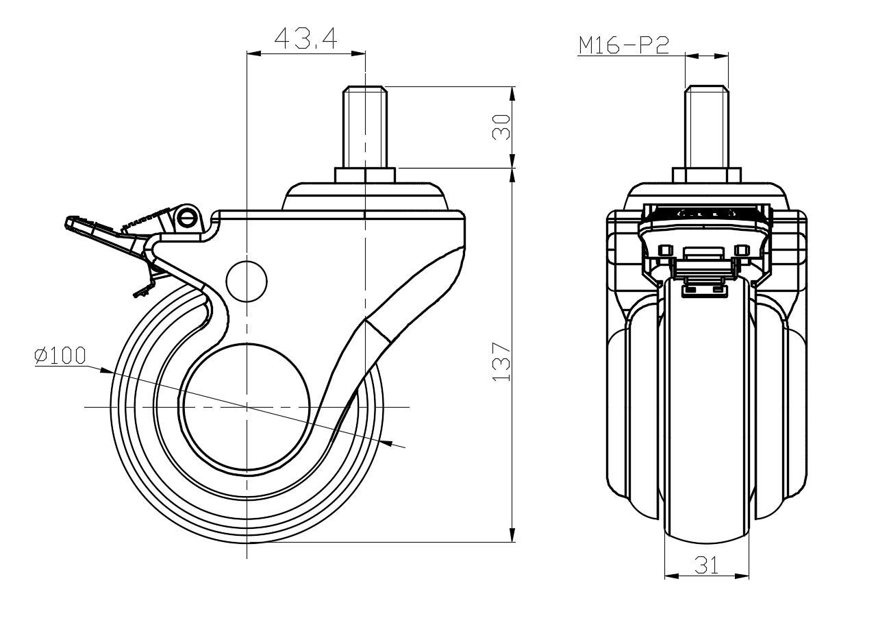| Castors with Total Brake Locking system. Thread-Riveted Stamping Fork - M16-P2 Surface Zine-Plated, Mounting Type - Threaded Stem + thread protector High-quality Impact Resistance Polypropylene Wheel Center,High-Quality Thermoplastic Rubber (TPR) Wheel Tread Pearl-colored dark gray, Bearing - Ball Bearing. |