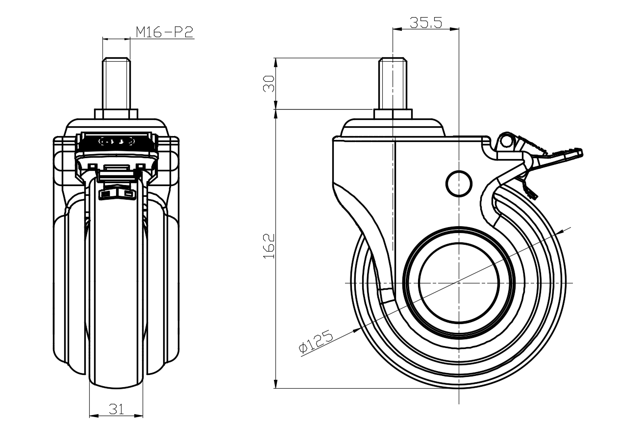 | Castors with Total Brake Locking system. Thread-Riveted Stamping Fork - M16-P2 Surface Zine-Plated, Mounting Type - Threaded Stem + thread protector High-quality Impact Resistance Polypropylene Wheel Center,High-Quality Thermoplastic Rubber (TPR) Wheel Tread Pearl-colored dark gray, Bearing - Ball Bearing. |