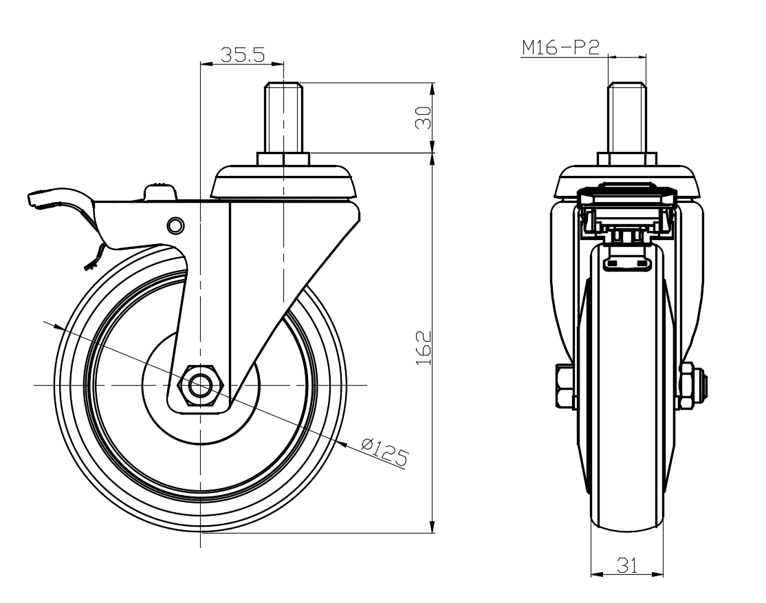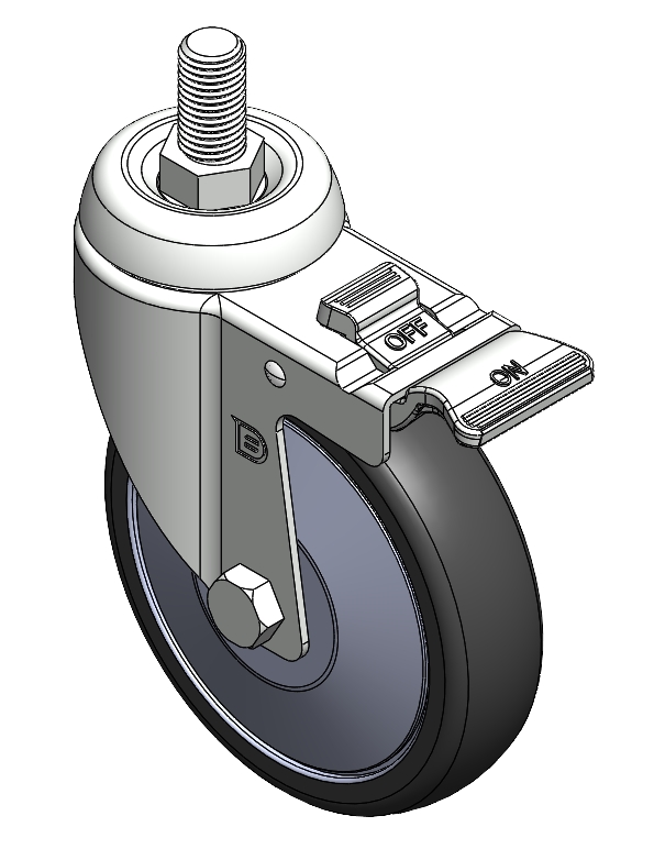| Castors with Total Brake Locking system. Threaded Fork - M16-P2 Extended control lever surface, Mounting Type - Threaded Stem High-quality Impact Resistance Polypropylene Wheel Center,High-Quality Thermoplastic Rubber (TPR) Wheel Tread Pearl grey, Bearing - Ball Bearing. |