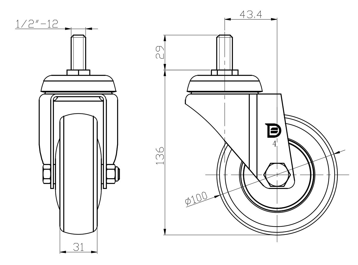 Swivel Caster with Riveted Stamping Fork—1/2"-12"