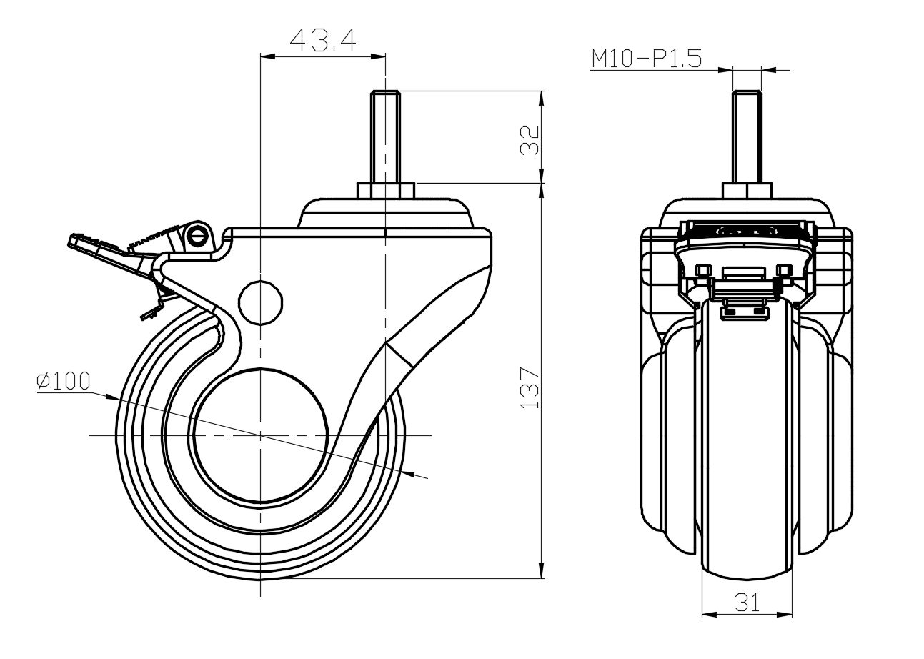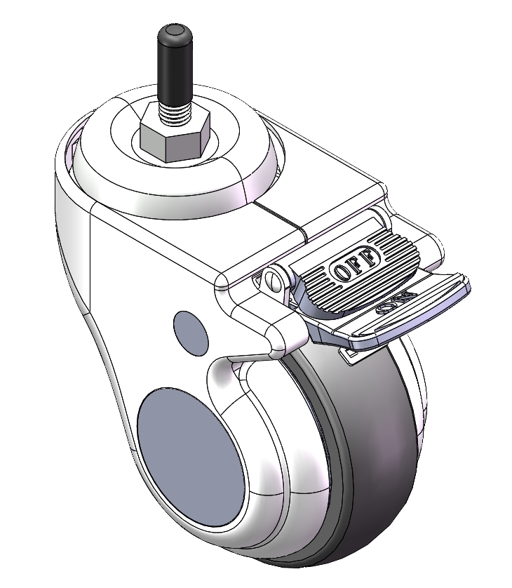 | Castors with Total Brake Locking system. Thread-Riveted Stamping Fork - M10-P1.5 Surface Zine-Plated, Mounting Type - Threaded Stem + thread protector High-quality Impact Resistance Polypropylene Wheel Center,High-Quality Thermoplastic Rubber (TPR) Wheel Tread Pearl-colored dark gray, Bearing - Ball Bearing. |