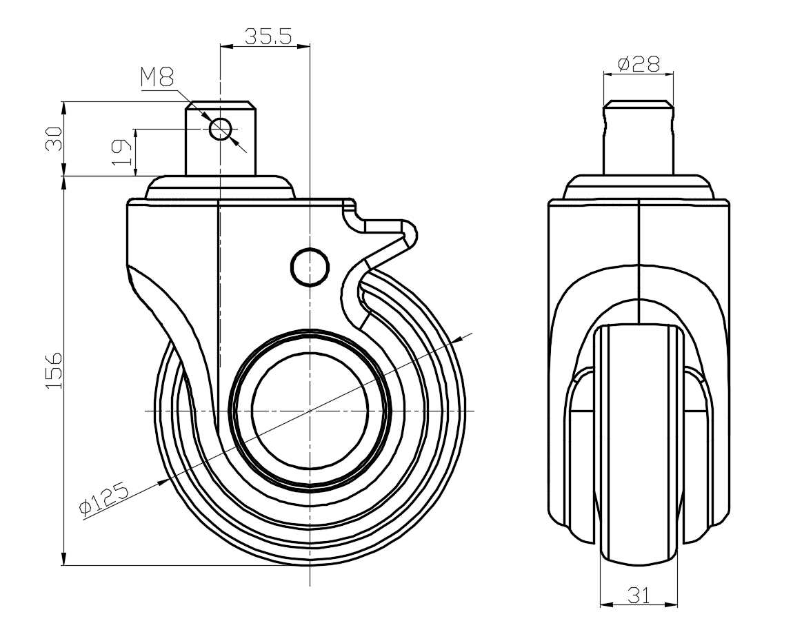 | Swivel castor, Riveted Stamping Fork - Ø28x30L Surface Zine-Plated, plug-in Mounting Type, M8 hole High-quality Impact Resistance Polypropylene Wheel Center,High-Quality Thermoplastic Rubber (TPR) Wheel Tread Pearl-finish dark grey, Bearing - Ball Bearing. |