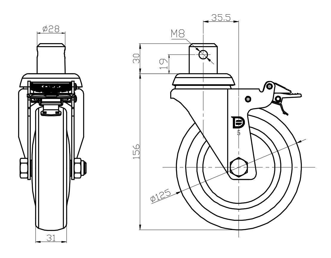 | Castors with Total Brake Locking system. Stamped and Riveted feet - Ø28x30L Surface zinc-plated, stud Mounting Type, M8 hole High-quality Impact Resistance Polypropylene Wheel Center,High-Quality Thermoplastic Rubber (TPR) Wheel Tread Pearl-finish dark grey, Bearing - Ball Bearing. |