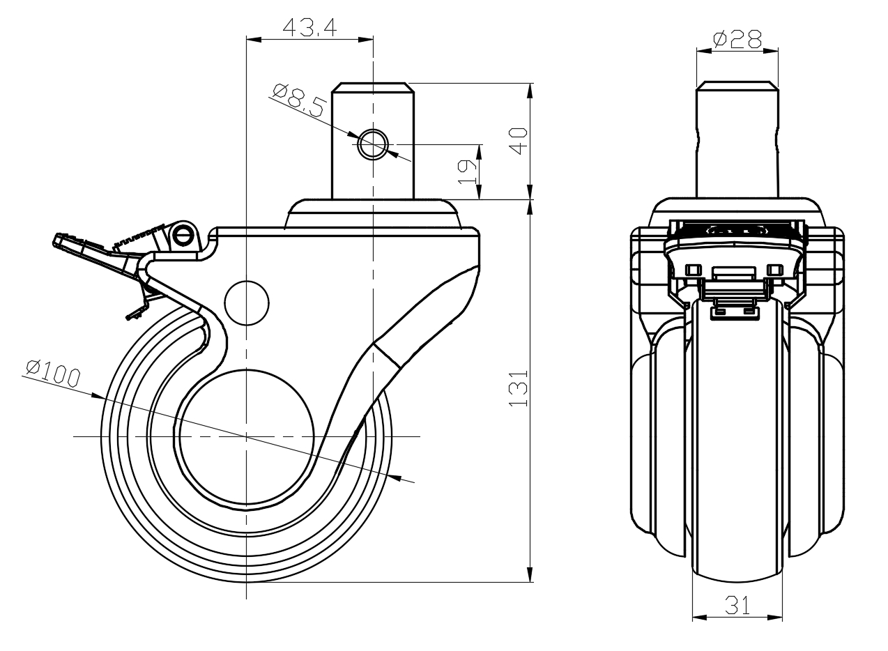 | Castors with Total Brake Locking system. Stamped and Riveted feet – Ø28x40L Surface zinc-plated, stud-type Mounting Type, Ø8.5 hole High-quality Impact Resistance Polypropylene Wheel Center,High-Quality Thermoplastic Rubber (TPR) Wheel Tread Pearl-finish dark grey, Bearing – Ball Bearing. |   | |||||