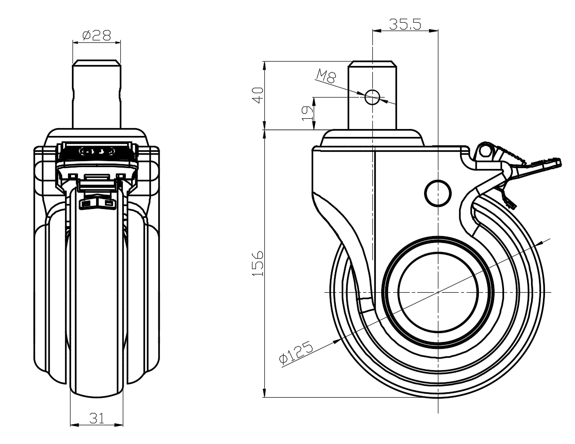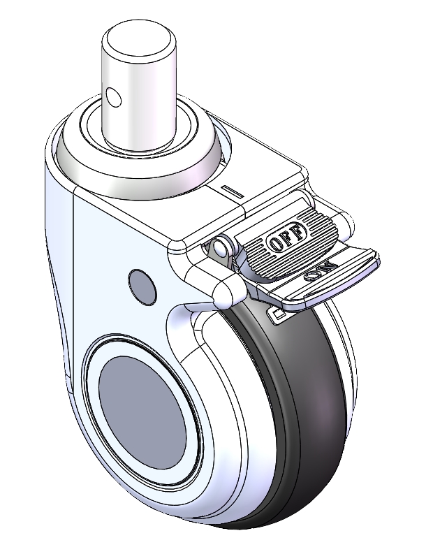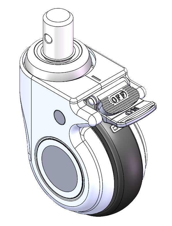 | Castors with Total Brake Locking system. Stamped and Riveted feet - Ø28x40L Surface zinc-plated, stud Mounting Type, M8 hole High-quality Impact Resistance Polypropylene Wheel Center, Thermoplastic Elastomer (TPR) Wheel Tread Pearl-finish dark grey, Bearing - Ball Bearing. |   | |||||