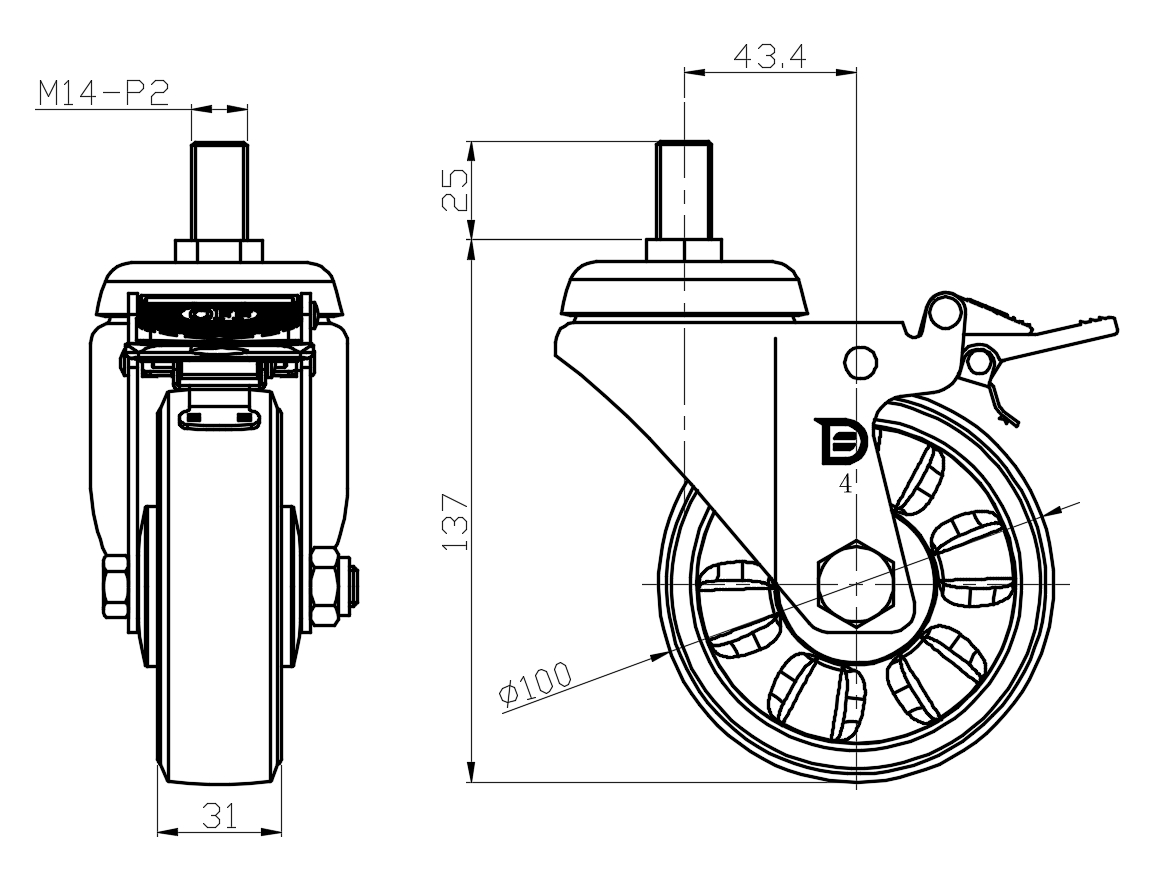 | Casters with a Total Brake and With locking system. Threaded Stem Riveted Pressed Fork—M14-P2 Zine-Plated, Mounting Type - Threaded Stem Reinforced, impact-resistant polypropylene core with High-Quality Reinforced Polypropylene Rubber (TPR) Wheel Tread Pearl-finish dark gray, Bearing—Ball Bearings. |   | |||||