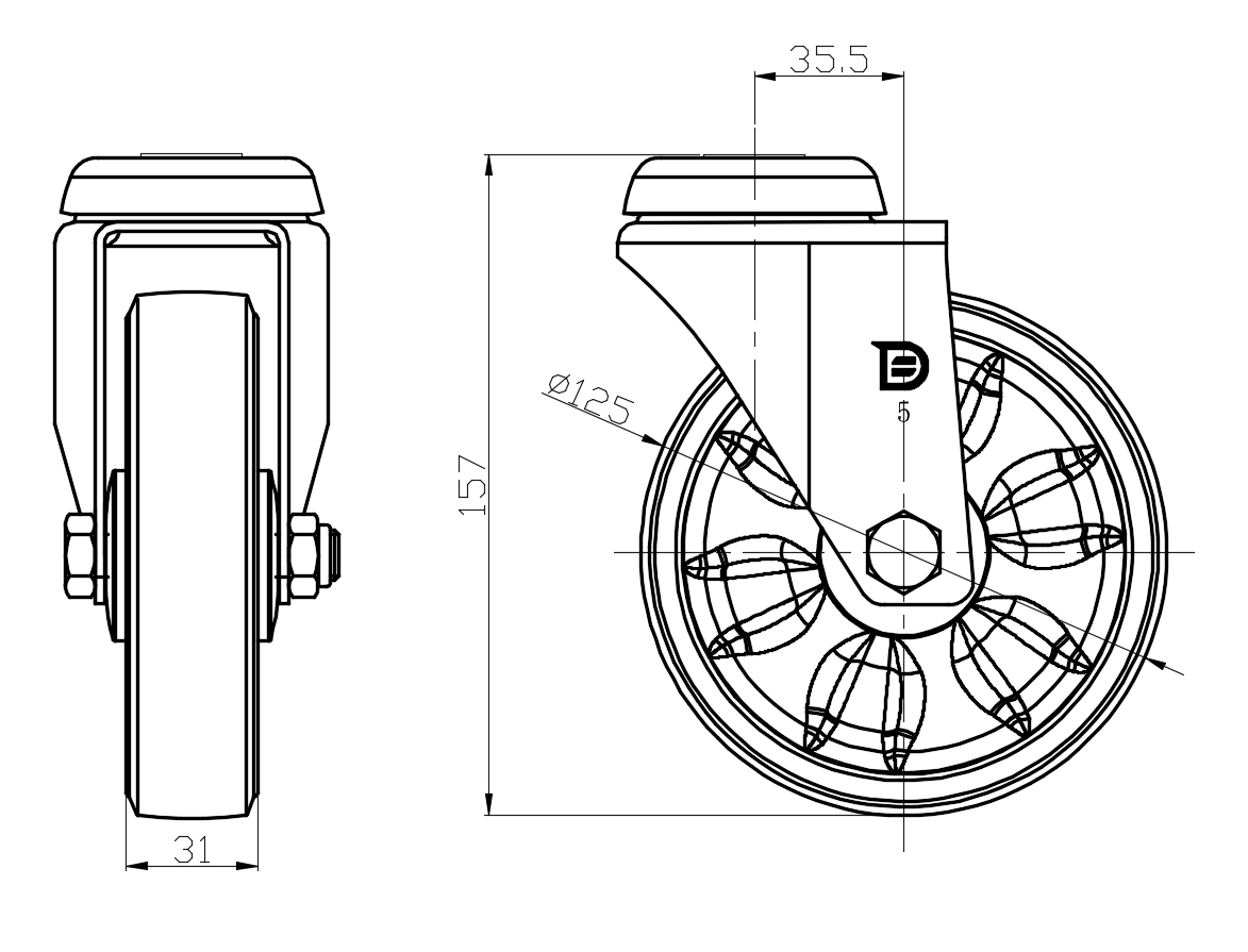 | Swivel Caster with hollow rivet Stamping Fork (12.5 holes) Zine-Plated, Mounting Type - Single Bolthole Reinforced, impact-resistant polypropylene core with High-Quality Reinforced Polypropylene Rubber (TPR) Wheel Tread Pearl-finish dark gray, Bearing – Ball Bearings. |   | |||||