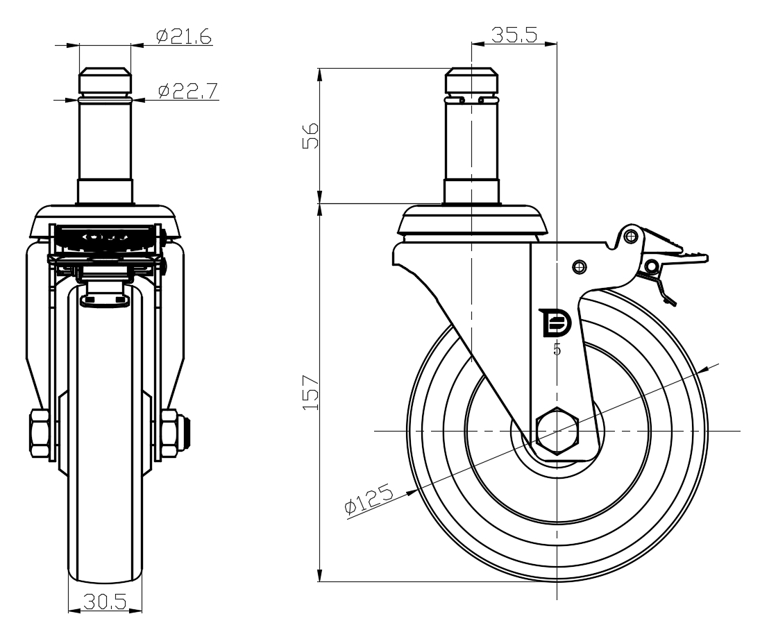 | Casters with Total Brakes and With locking system. Riveted Stamping Fork—Ø21.6x56L Zine-Plated, Mounting Type - Cylindrical Stem Reinforced Polypropylene Wheel Center with High-Quality Resilient Rubber Wheel Tread Wheels—Central tube |   | |||||
